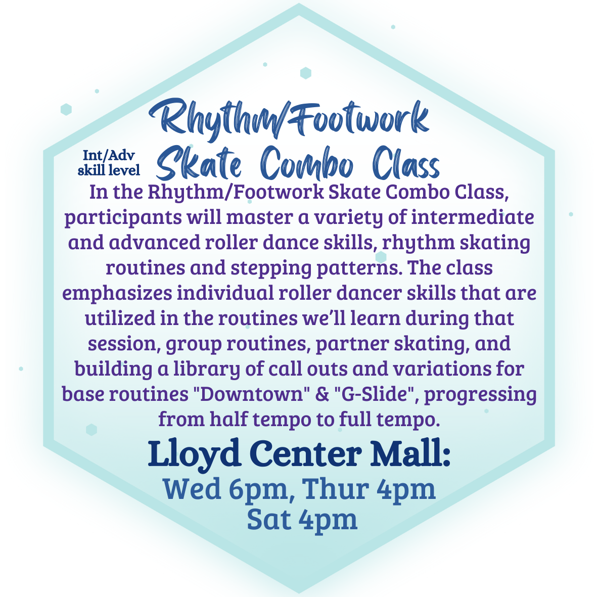 In the NE Rhythm/Footwork Skate Combo Class at our skate studio in Lloyd Center Mall, participants will master a variety of intermediate and advanced roller dance skills, rhythm skating routines and stepping patterns. The class emphasizes individual roller dancer skills, group routines, partner skating, and building a library of call outs and variations for base routines "Downtown" & "G-Slide", progressing from half tempo to full tempo.