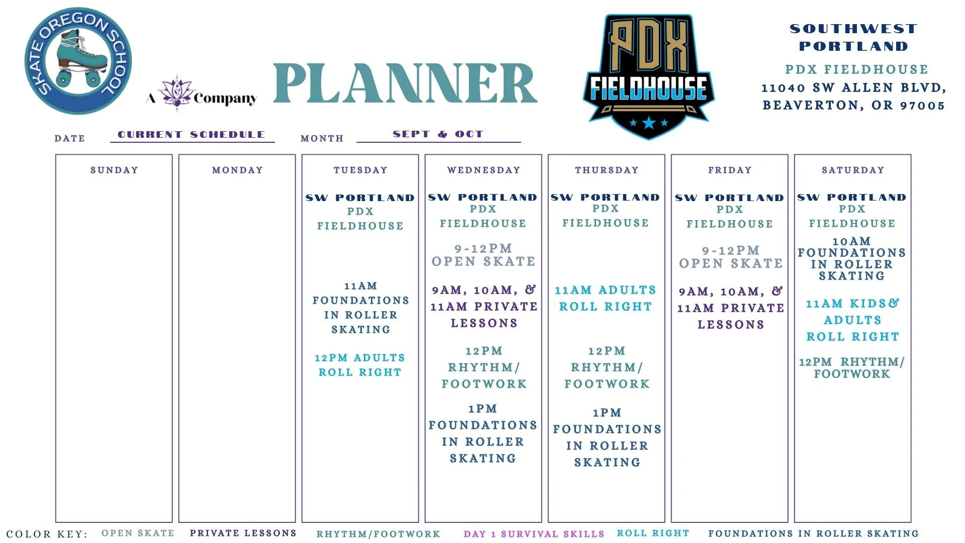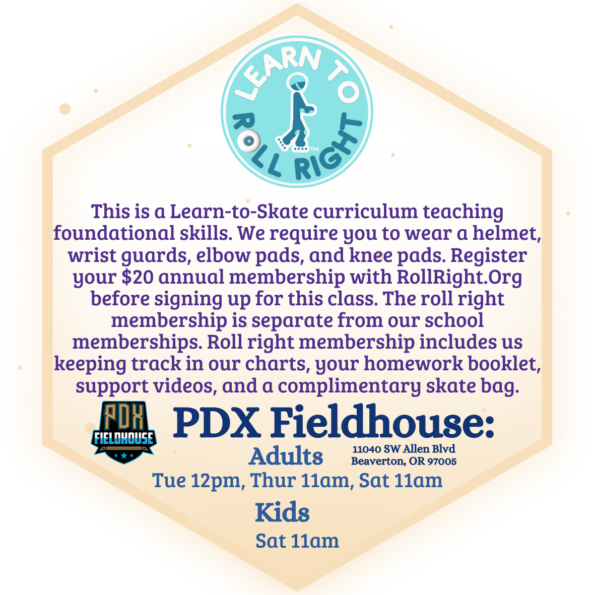 Beaverton Location: You're going put “PDX Fieldhouse, 11040 SW Allen Blvd, Beaverton, OR 97005" into your gps and park off the street leading up to the fieldhouse. Do not park in front of the building. We’ll be inside at the inline roller hockey rink.