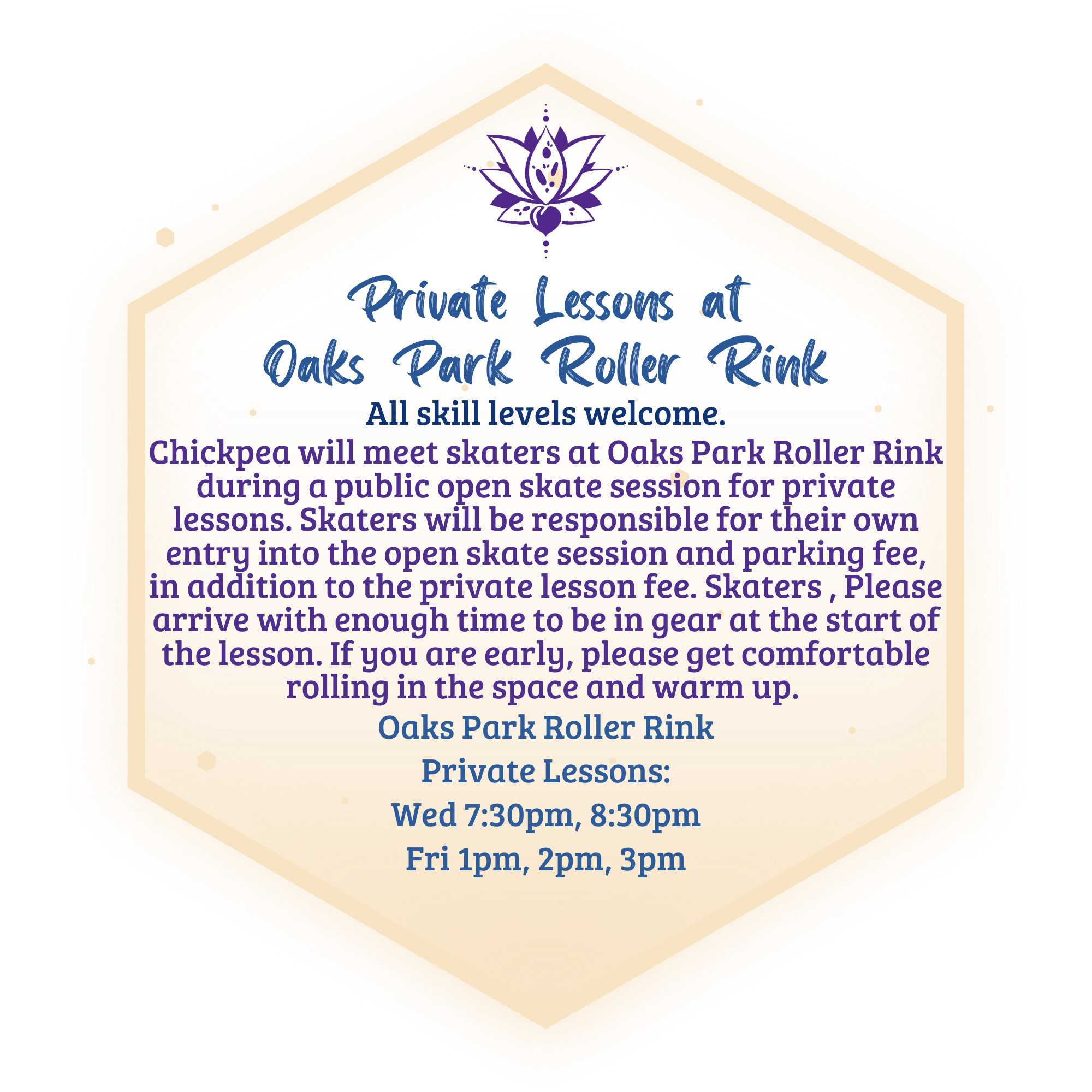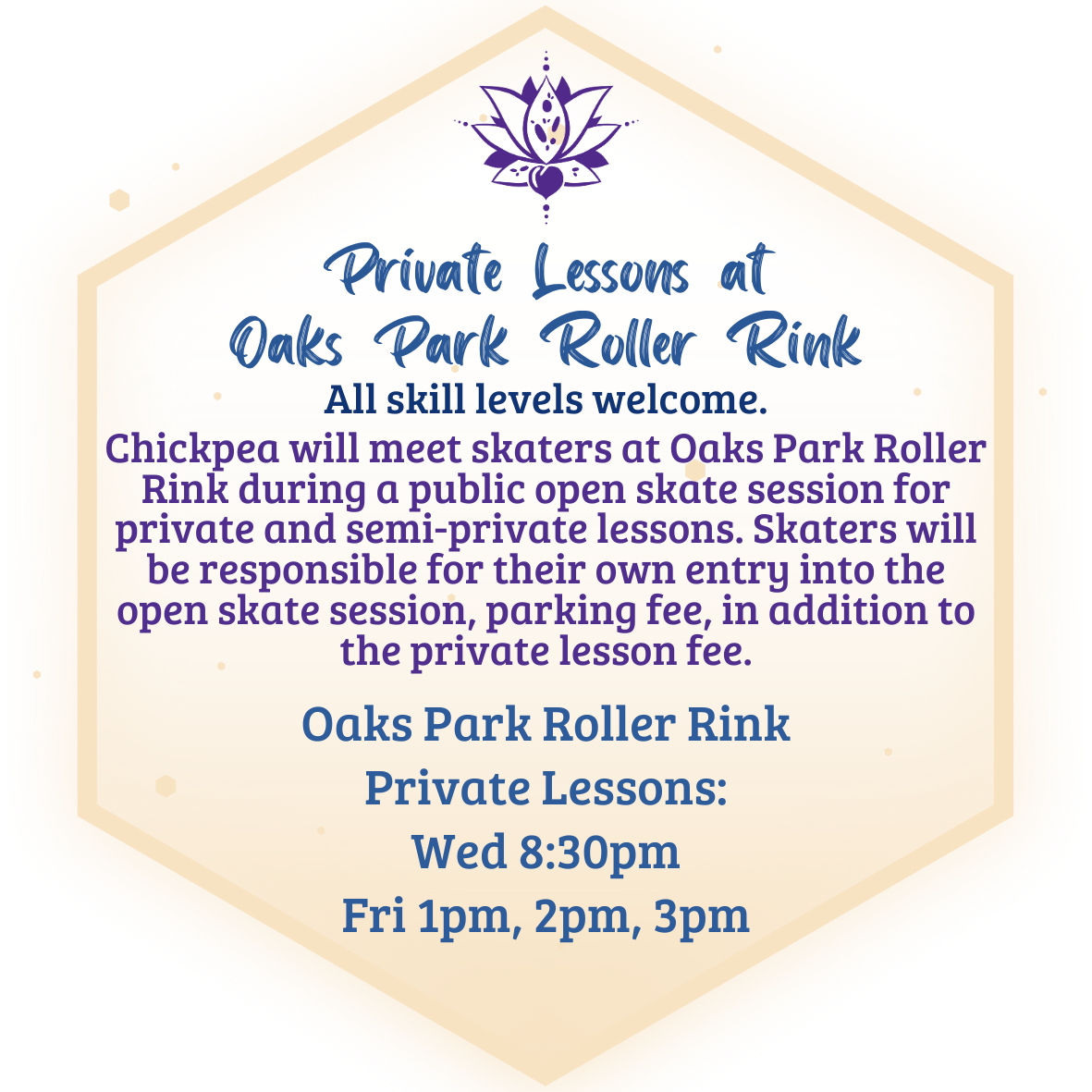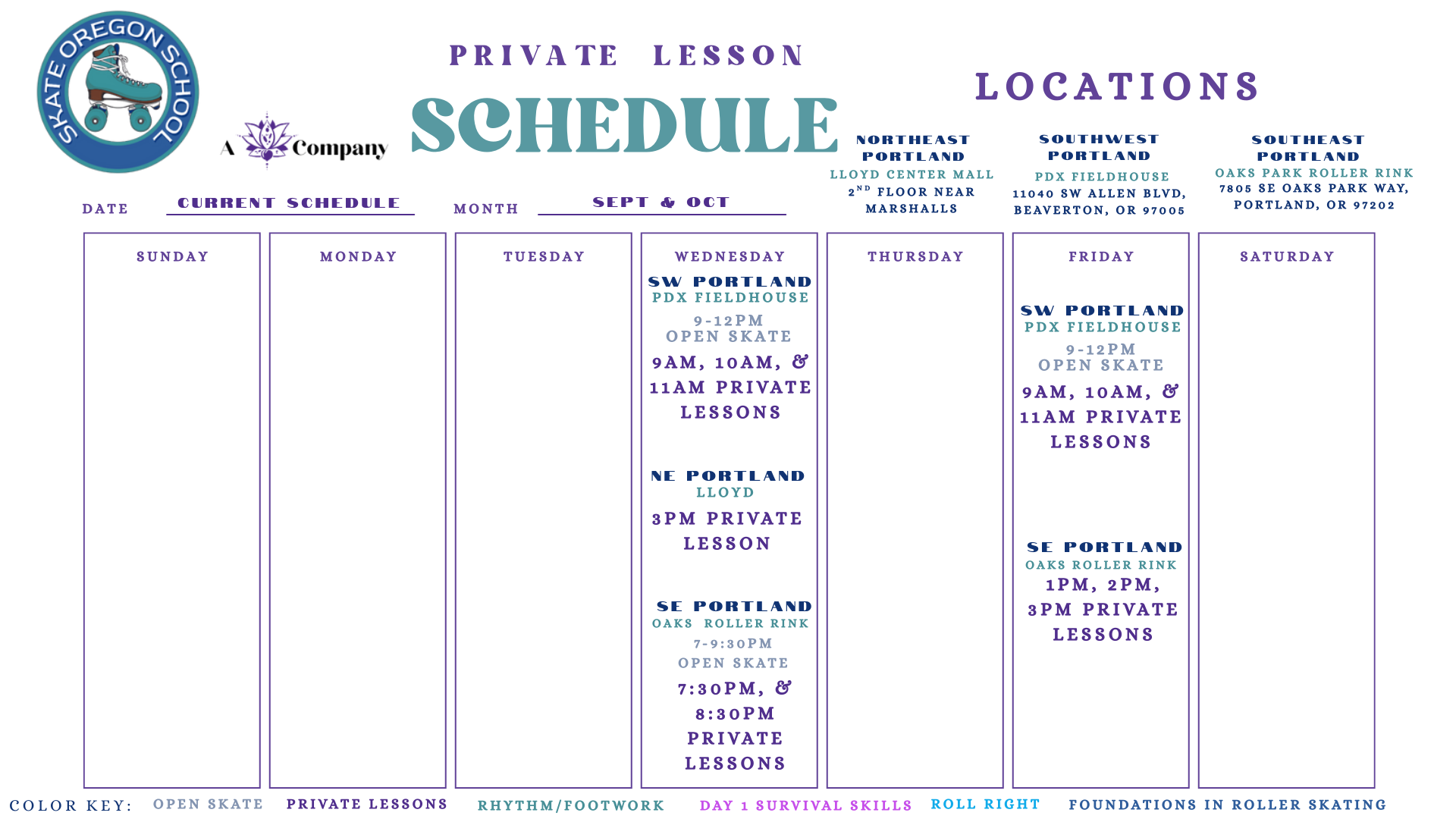 **For private lessons at Oaks Park Roller Rink, Students are additionally responsible for their own entry into Oaks Park Open Skate session on Wednesdays from 7-9:30pm and/or Fridays from 1-5pm as well as their parking fee. We create and protect the students safe space at the rink during the lesson.**